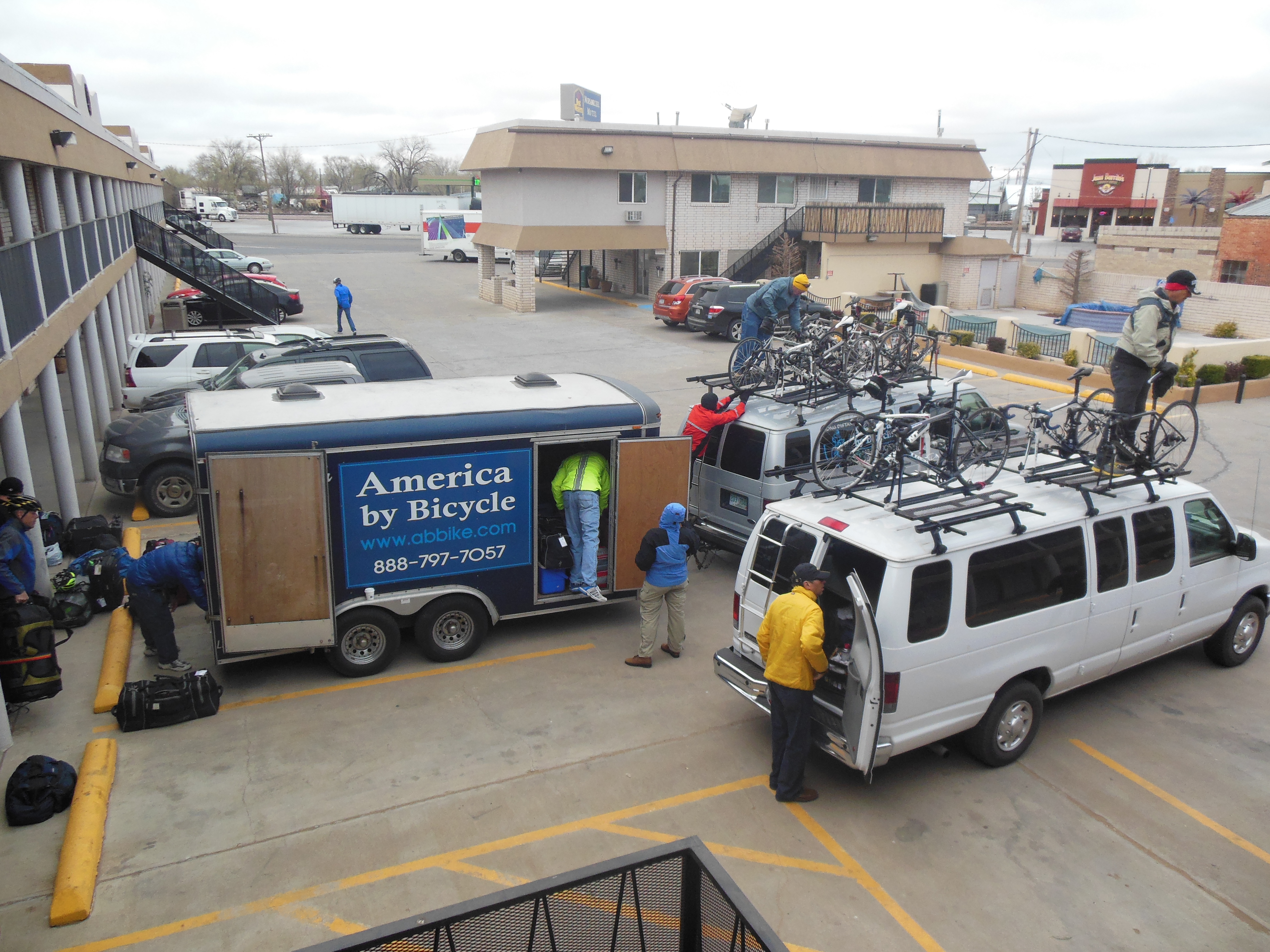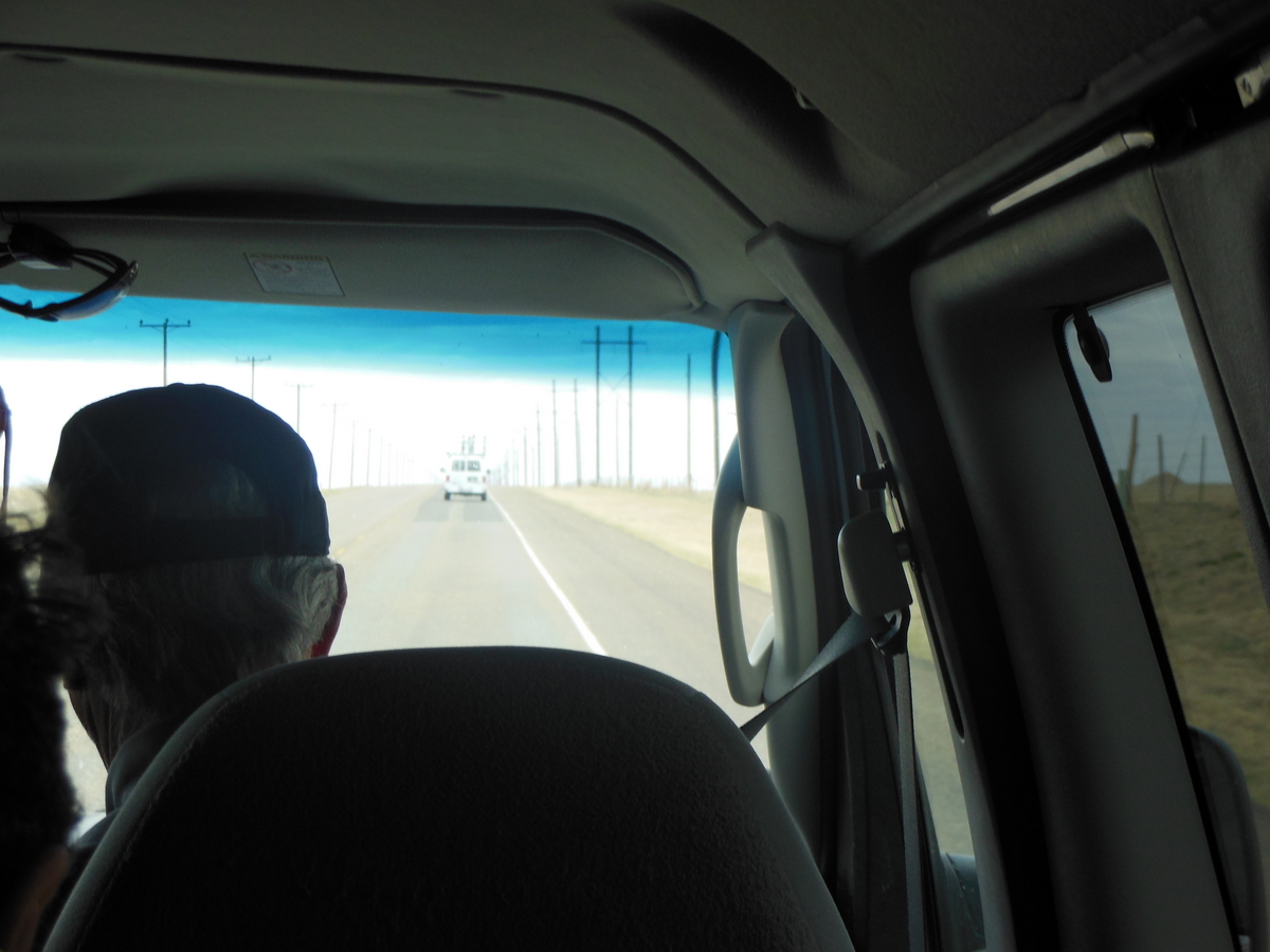 DSCN0609Dat vond ook de organisatie. Mike besloot met pijn in het hart de etappe naar Liberal, Kansas te cancellen. En dat schijnt hij niet vaak te doen. Maar dit soort winterse omstandigheden leveren te veel gevaar voor lijf en leden op. Dus we hadden een heuse verplaatsing. Het lijkt de Tour wel. Of beter: Milaan-San Remo, waar de verkleumde renners dit jaar ook een stuk per bus zijn verplaatst vanwege te winterse omstandigheden.