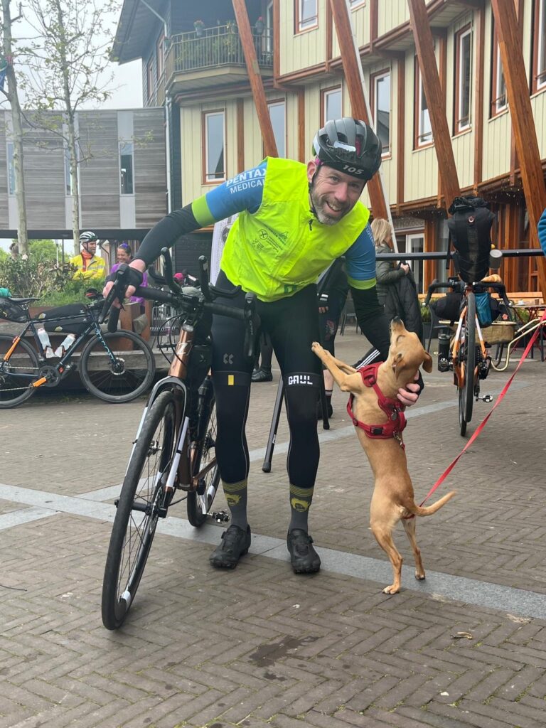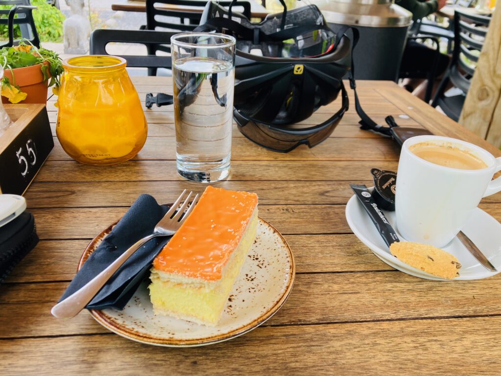 Vlak voordat we het Nationaal Park de Hoge Veluwe indraaien, zie ik een mooi terras om te pauzeren. Ze blijken zelfs een oranje tompouce te serveren. Hetgeen op spontaan gejuich van me komt te staan. Na de mooie slingerende paadjes van de Veluwe, met een zuigend windje tegen, draaien we richting Posbank. De aanloop via de Zijpeberg is ook weer overbekend. Zelfs exact het parcours dat ik een paar weken geleden al bikepackend ben gevolgd in training voor deze Race Around The Netherlands (RATN).