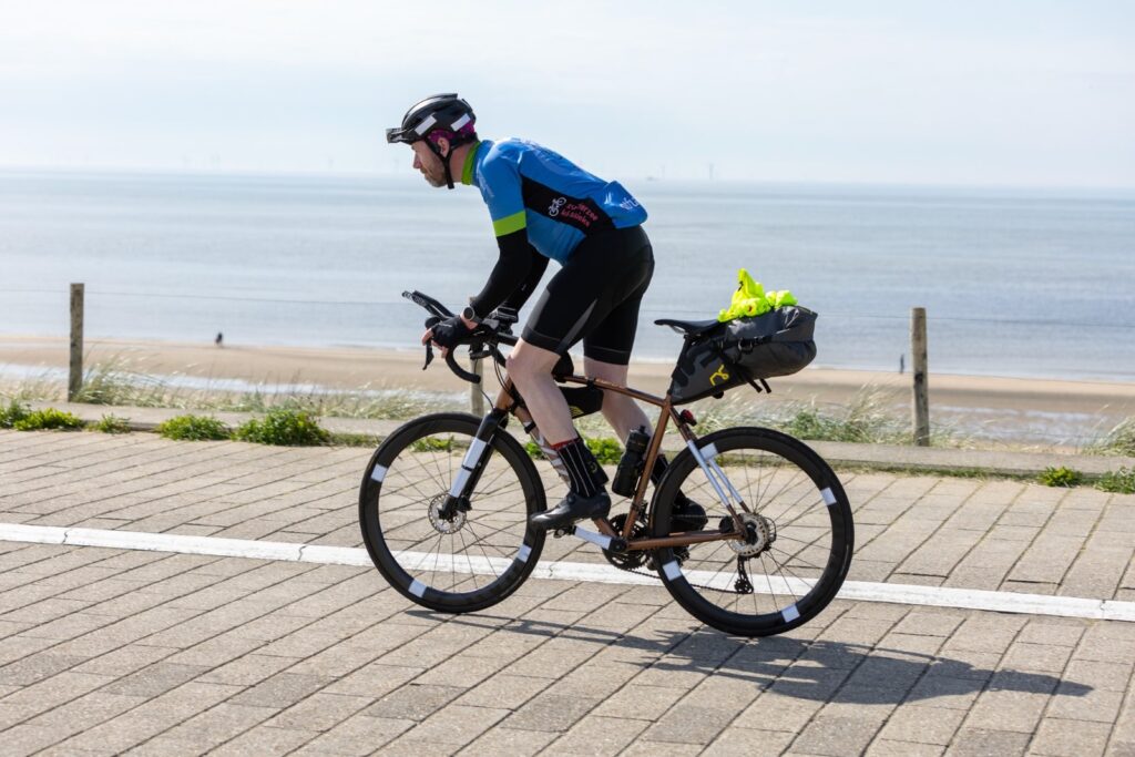 Naar Beverwijk, dan naar de zeesluizen bij IJmuiden waar ik iedere bocht ken, dus ik laveer er soepel langs. Dan doemt het Kopje van Bloemendaal op. Voor de 130e keer sinds de GPS registratie. Voeg daar tientallen malen voor die tijd aan toe. Maar nog niet eerder deed ik het na 200km en met bepakking. Het wordt dan ook mijn langzaamste tijd. Dat deert me niet. Door naar Bloemendaal aan zee, windje in de rug langs de Zeeweg. Op de boulevard ontwaar ik in een flits een andere studiegenoot Bart die me komt supporteren en fotograferen. Hoe leuk en aardig! Ik stop kort en dan weer door, op naar mijn favoriete Langevelderslag tussen Zandvoort en Noordwijk.