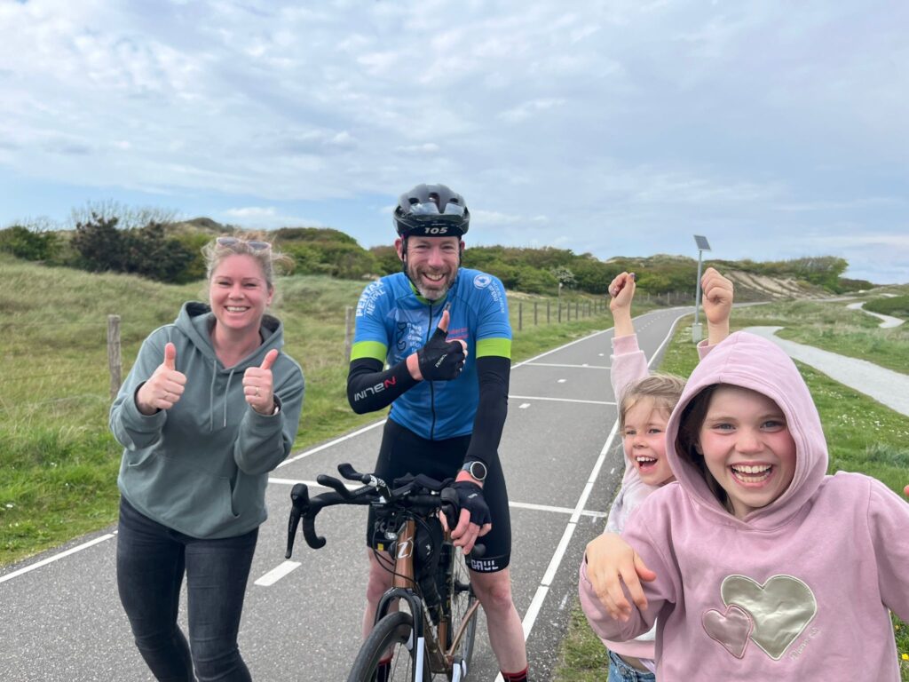 Bij Katwijk staat collega Marlyne met haar gezin om me aan te moedigen. Weer hartverwarmend en goed voor het moraal. Iets verderop aan de boulevard van Katwijk strijk ik neer op een terras om mijn plan voor de avond te trekken. Er is regen op komst, best veel volgens buienradar. Ik besluit mijn tocht voort te zetten tot Monster, tussen Den Haag en Hoek van Holland. Ondertussen herschik ik ook mijn sokken en schoenen, waardoor het branderige gevoel rechts gelukkig weer verdwijnt.