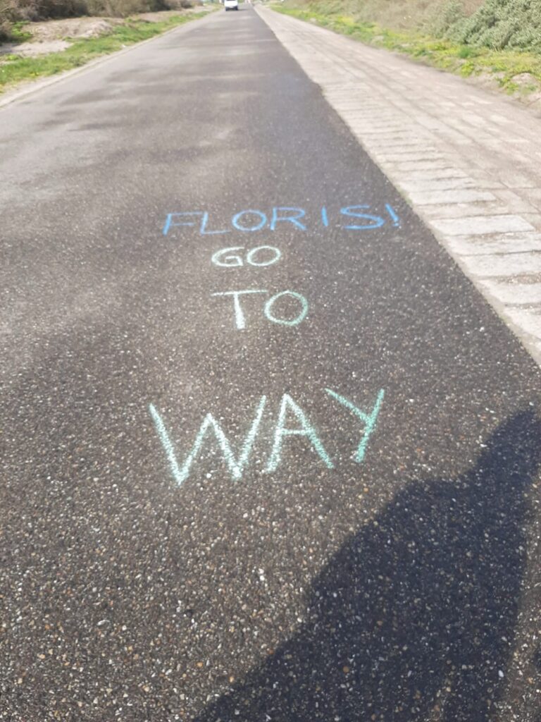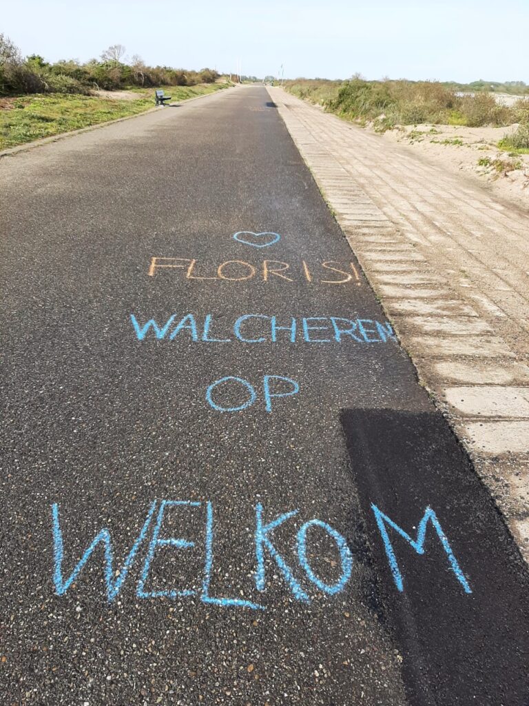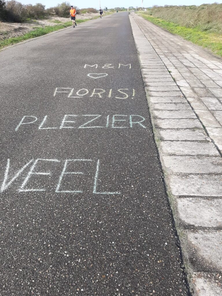 Ik was vooraf ingeseind en ja hoor, ik ontwaar op het wegdek een aantal aanmoedigingen voor me die door vrienden Marga en Martin zijn geschilderd. Nietsvermoedende toeristen fietsen er overheen, maar ik kan ze goed in me opnemen. Weer een geweldige stimulans voor het moraal!